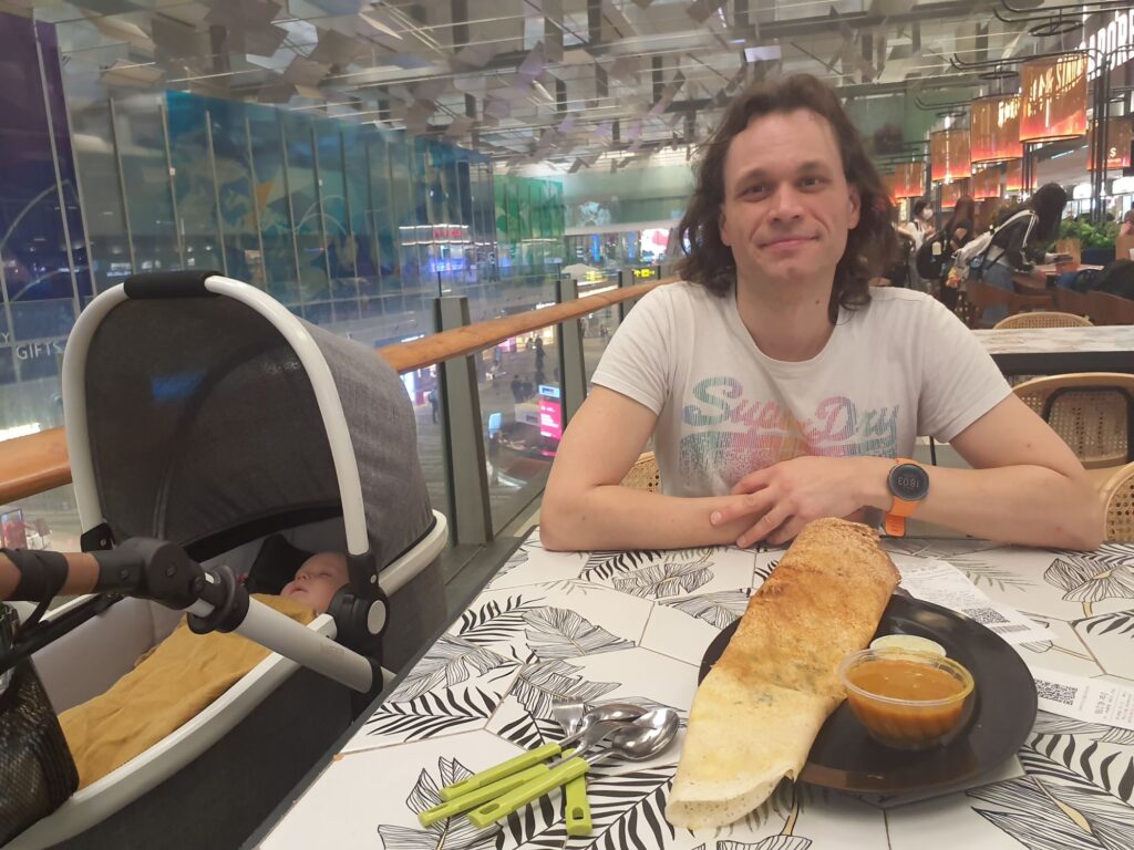 Zum Glück schaffen wir es noch trocken zurück nach Hause, doch als wir gerade mit dem Fahrstuhl nach oben fahren, fängt es an zu donnern und zu regnen. Kurzerhand sagen wir den Besuch der Rooftop Terrace ab. Nach einem Kaffee bestellen wir dann über die App, mit Annes Hilfe, unser Taxi. Wegen des Regens haben wir lieber etwas früher angefangen und sind froh, dass am Ende unser ganzes Gepäck in das kleine bestellte Taxi passt. Wir mussten auch ein bisschen puzzeln, aber es hat gepasst. Unten am Gebäudeausgang verabschieden wir uns von Anne und Nico. Vin hatten wir schon am Morgen Tschüß gesagt. Dann geht es los. Wir sind fast 3 Stunden früher am Flughafen, also sehr früh, aber am Ende ist das ganz gut. Ich finde meine Halstabletten nicht mehr, also haben wir Zeit um in der Apotheke in Terminal 3 Ersatz zu kaufen. Außerdem können wir noch Abend essen bevor wir ins Flugzeug steigen. U.a. Essen wir Dosa, das wir am Vortag zum ersten Mal probiert hatten.