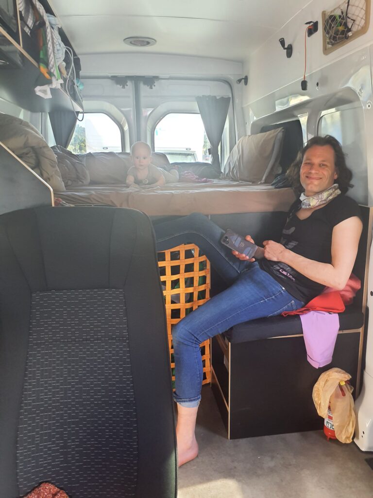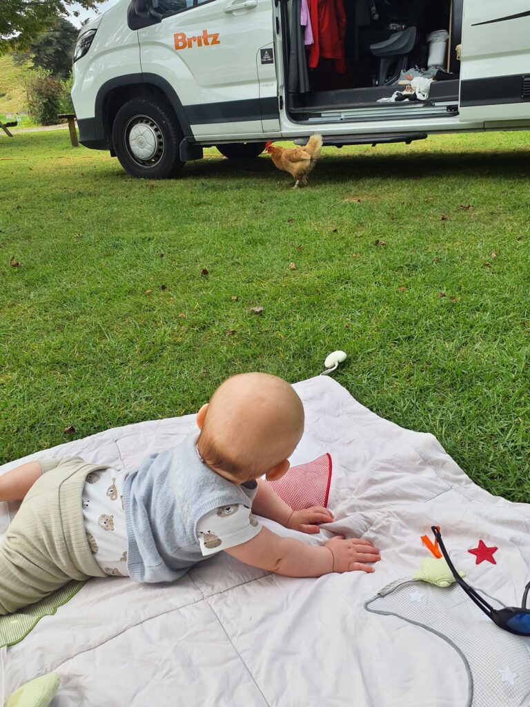 Wir kommen nach fast ner halbe Stunde Spaziergang wieder am Campingplatz an, sind ganz schön fertig und ruhen uns erst einmal aus. Elias muss eh gestillt werden, das mache ich im Liegen im Van, und er schläft dabei ein. Es ist die zweite Nacht auf diesem Campingplatz, der zwar für jeden Stellplatz ein Privatbad hat, aber dieses leider weder über einen Spiegel (zum Rasieren oder für Kontaktlinsenträger) verfügt, noch über einen Fön. Recyceln kann man hier auch nicht und es gibt keine Abwasserentsorgungsstation. Das wird nicht unser Lieblingscampingplatz, aber immerhin war der Besitzer per E-Mail sehr gut und schnell zu erreichen.