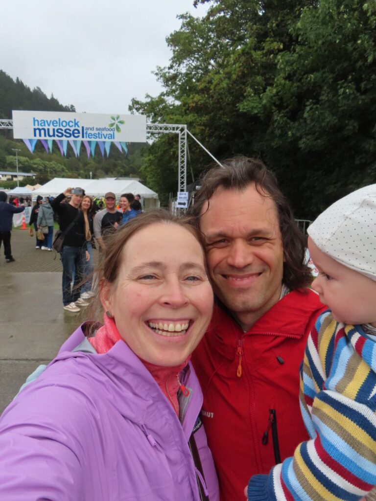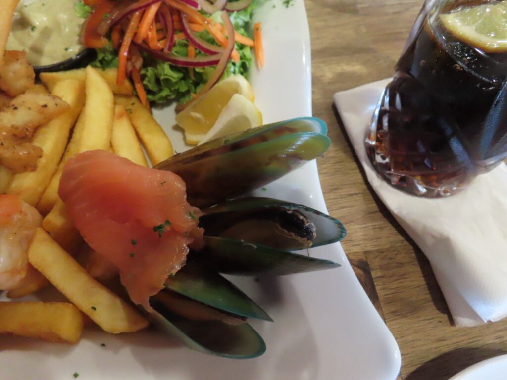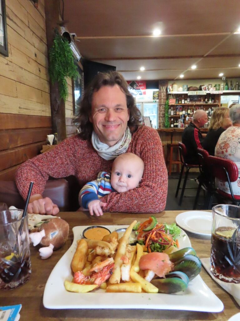 Wir beschließen in Havelock Pause zu machen. Dort gibt es das Restaurant The Mussel Pot, das uns von einem Freund empfohlen wurde, und dort wollen wir Grünschalmuscheln essen, die es nur in Neuseeland gibt und die wohl sehr gesund sein sollen. Leider hat das Restaurant sowie alle anderen im Ort zu als wir ankommen, da an diesem Tag das jährliche Muschelfestival stattfindet. Wir denken erst, dass wir einfach auf dem Festival Muscheln essen können, stellen dann aber fest, dass man Tickets haben muss und die kosten 60 NZD pro Person, also lassen wir es. Wir sind enttäuscht nun gar keine Muscheln essen zu können, erfahren dann aber, dass man die überall in der Region essen kann. Wir machen also nur einen kurzen Spaziergang zum Festival, das am Hafen stattfindet, füttern und stillen Elias, danach ziehen wir weiter. In Picton, wo die Fähre ablegt, kommen wir gegen 13 Uhr an und beschließen hier die Günschalmuscheln zu essen. In einem Pub teilen wir uns eine Meeresfrüchteplatte, auf der auch Grünschalmuscheln sind. Die Muscheln sind riesig. Ich hatte sie viel kleiner erwartet, sind es doch Miesmuscheln. Außerdem werden sie kalt serviert und gegessen. Geschmacklich finden wir sie ganz gut, vor allem muss man nicht so viel puken wie bei den winzigen Miesmuscheln. Julian ist nicht so begeistert und wir sind uns beide einig, dass die 3 Muscheln genau die richtige Probiermenge waren und wir die nicht unbedingt noch einmal essen müssen. Zum Glück haben wir nicht die 1 kg Portion bestellt.