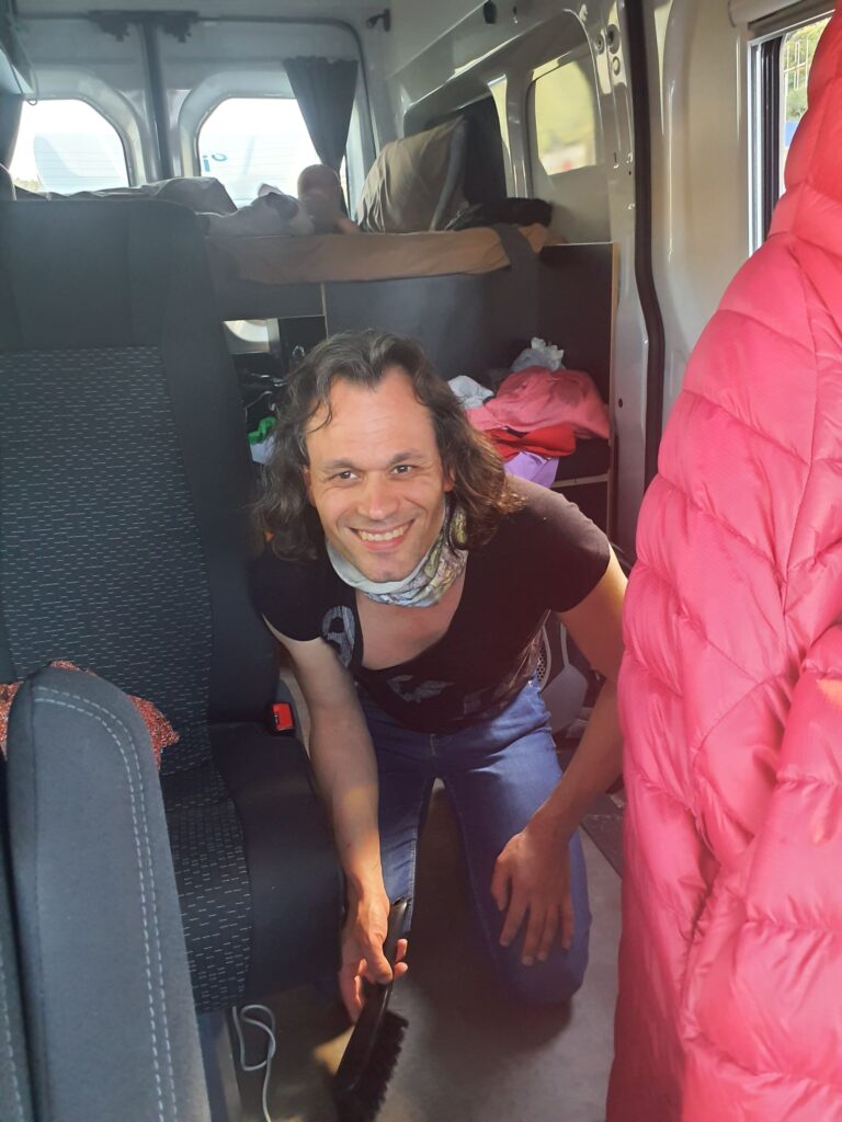 Nach dem Mittagessen und einem kleinen Spaziergang durch den Ort fahren wir zur Fähre, um dort einzuchecken. Wie erwartet müssen wir nach dem Check-in lange in der Schlange warten bis die Autos von der ankommenden Fähre runtergefahren sind und unsere Spur irgendwann reinfahren kann. Elias amüsiert sich derzeit auf dem Bett und wir nutzen die Zeit um Blog zu schreiben, aufzuräumen und zu putzen. Es ist bestimmt schon das dritte oder vierte Mal, dass wir den Van putzen müssen, und zweimal davon haben wir ihn zusätzlich auch wischen müssen. Eigentlich haben wir darauf gar keine Lust, aber der Dreck fällt einfach sehr schnell an. Es geht auch nicht immer die Schuhe auszuziehen und die Trittfläche ist nun mal sehr klein so dass sich der Dreck einfach schnell anhäuft.