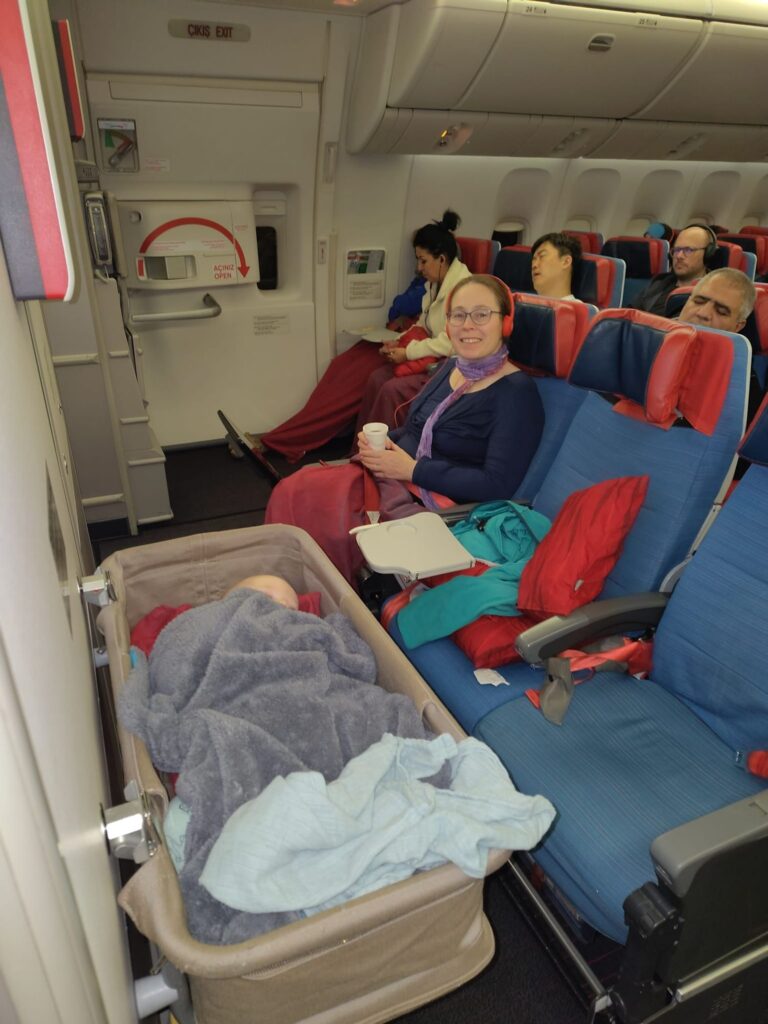 Am Flughafen in Genf angekommen, verläuft alles reibungslos und nach der kurzen Schlange bleibt uns sogar noch Zeit für einen kleinen Snack. In Istanbul gibt es für Eltern mit Kindern unter 5 Jahren und Senioren über 65 Jahren sogar eine seperate Sicherheitskontrolle beim Transfer. Keine Schlange, nettes Personal, so macht Reisen Spaß. Es ist auch nett, dass man mit Babies immer wie Buisiness behandelt wird, also auch als erstes ins Flugzeug steigen kann. Auf dem Flug nach Singapur nutzen wir das Babybassinet, das wir vorher durch die Buchung von Plätzen mit extra viel Beinfreiheit reserviert hatten, und sind begeistert. Wir glauben, der Kleine hat den Flug von uns Dreien am Besten verkraftet. Wir mussten ihn zwar ab und zu bei Turbulenzen aus dem Bassinet nehmen (aus Sicherheitsgründen) und wieder bei einem von uns auf dem Schoss anschnallen, aber dabei ist er meistens gar nicht aufgewacht bzw. sofort wieder in den Schlaf gefallen.