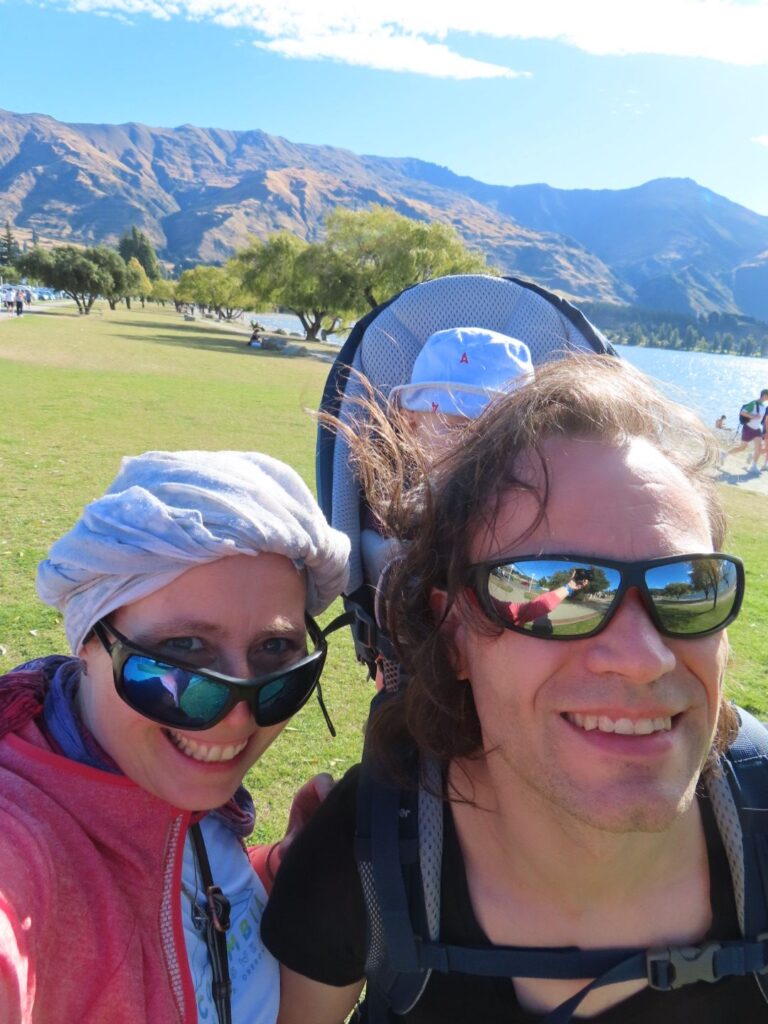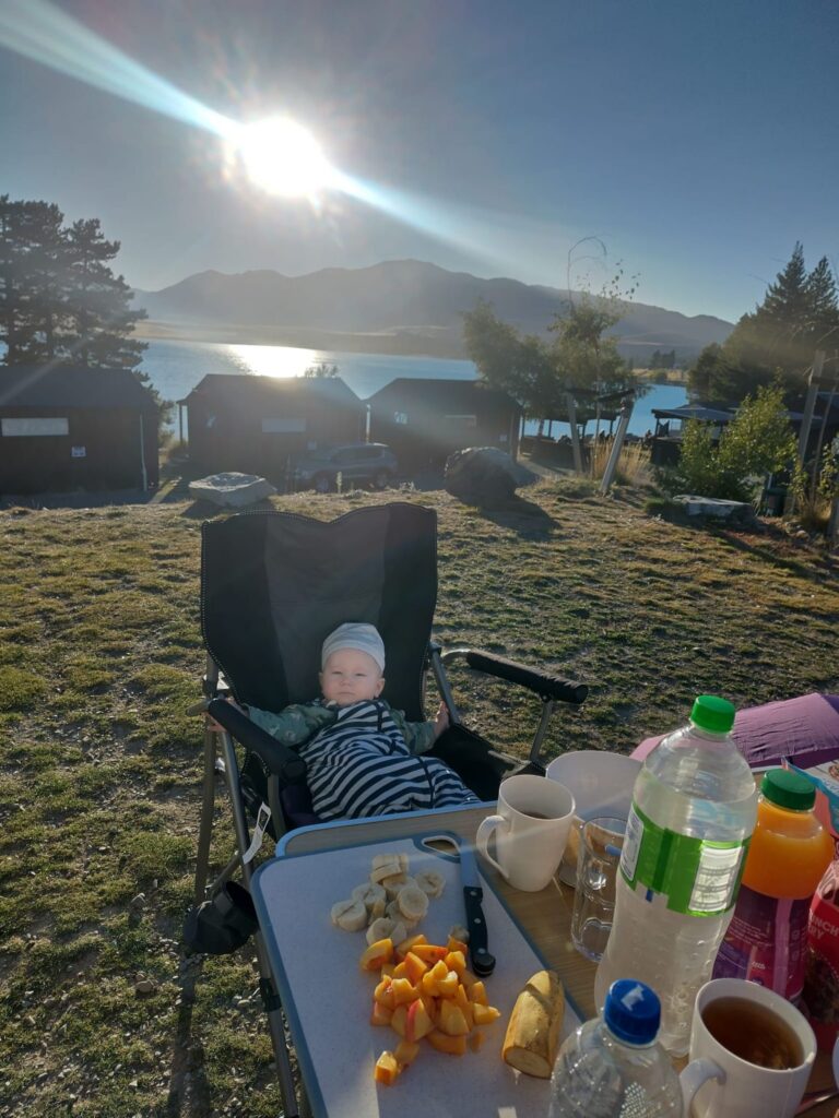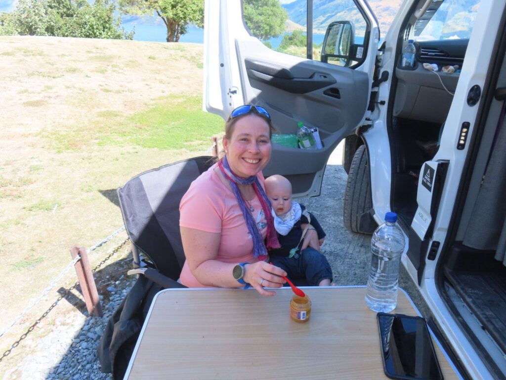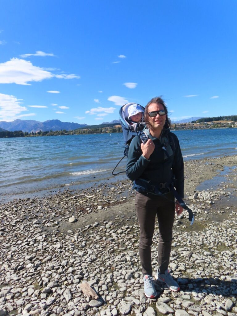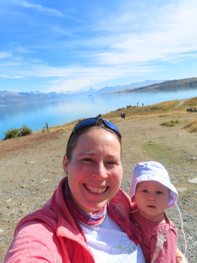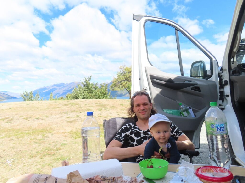 Die Fahrt ist wieder mal wunderschön und wir sind beeindruckt von der hübschen Landschaft. Wir sehen auch wieder viele Schafe und Rinder auf dem Weg und gewinnen den Eindruck, dass Landwirtschaft in Neuseeland einfach viel größer betrieben wird als bei uns. Wir halten öfter an, u.a. auch direkt am Wanaka Lake, wo wir unsere Stühle herausnehmen und direkt am Ufer des Sees eine Stillpause einlegen. Die Sonne tut gut, vor allem nach dem Regentag am Vortag. Als wir abends auf dem Campingplatz am Lake Hawea ankommen, sind wir allerdings nicht so begeistert. Unser Stellplatz liegt sehr weit von den Toiletten weg und der Campingplatz ist nicht sehr modern, die Anlagen in die Jahre gekommen. Das einzig nette ist die Lage direkt am Wasser und der Seeblick. Da wir noch voll von der Völlerei in Queenstown sind, essen wir abends nur etwas Brot und gehen dann ins Bett. Elias wacht nach dem Stillen um 20 Uhr zwar noch mal auf und ist dann länger wach, er ist aber ganz lieb und so lassen wir ihn machen. Es ist ja auch für ihn Urlaub.