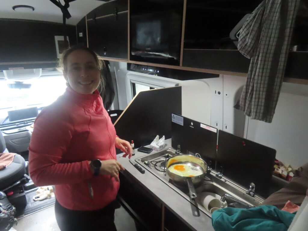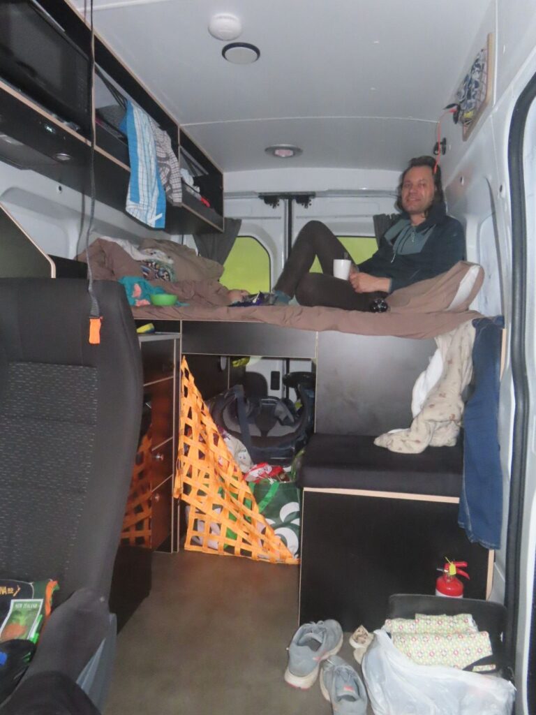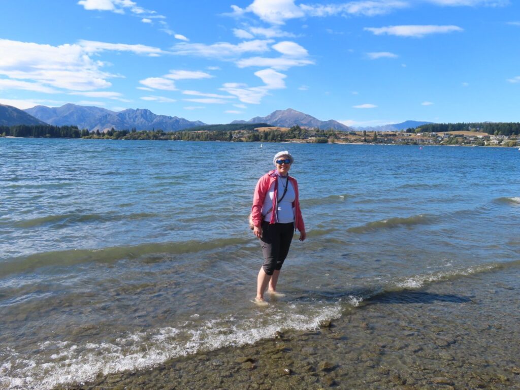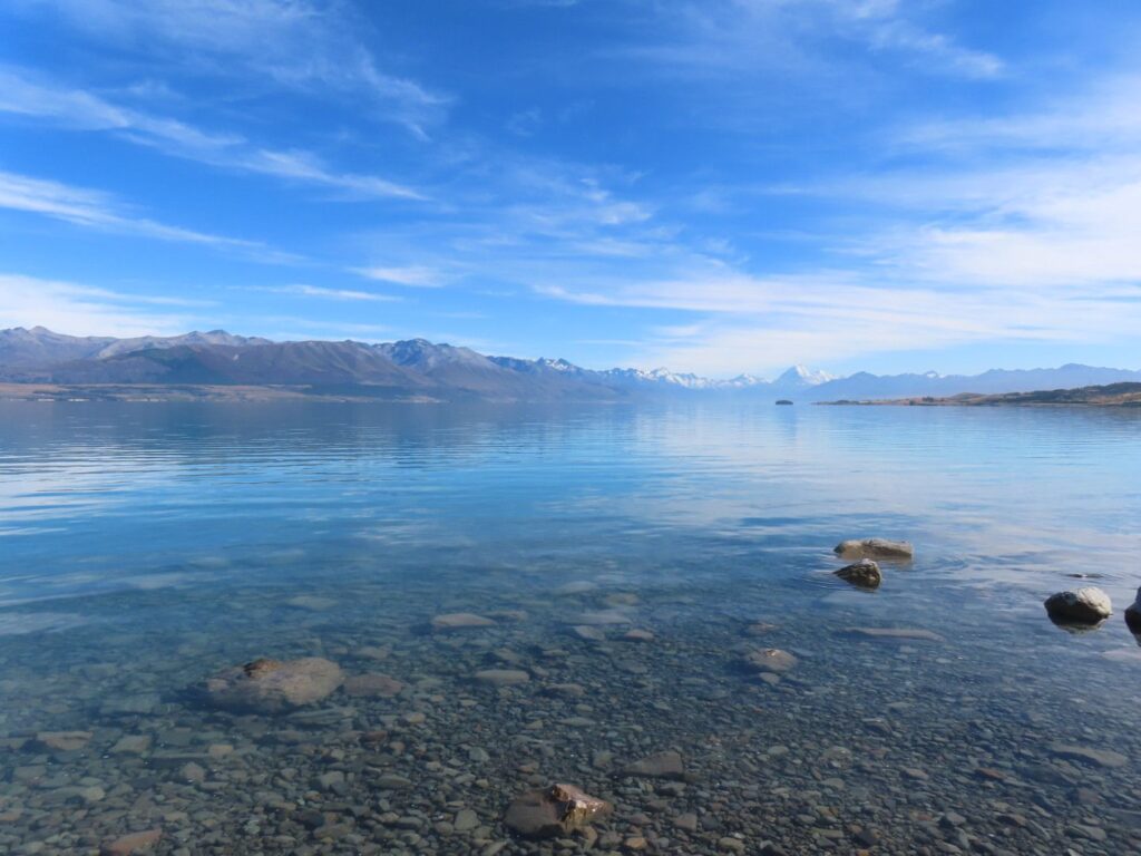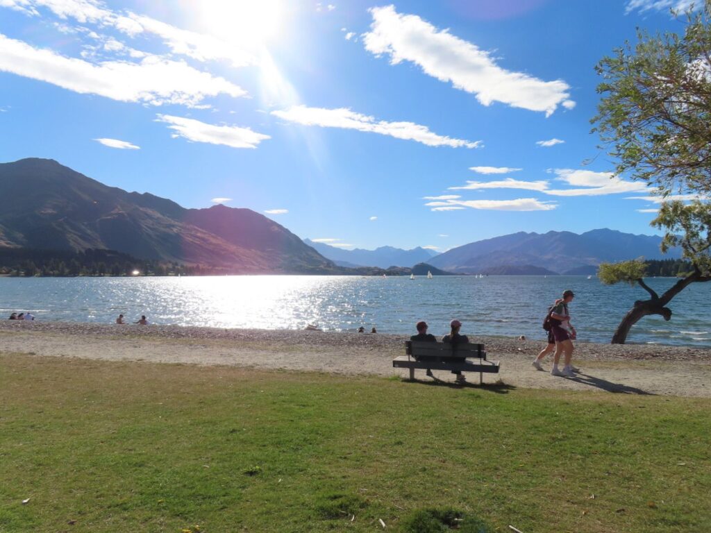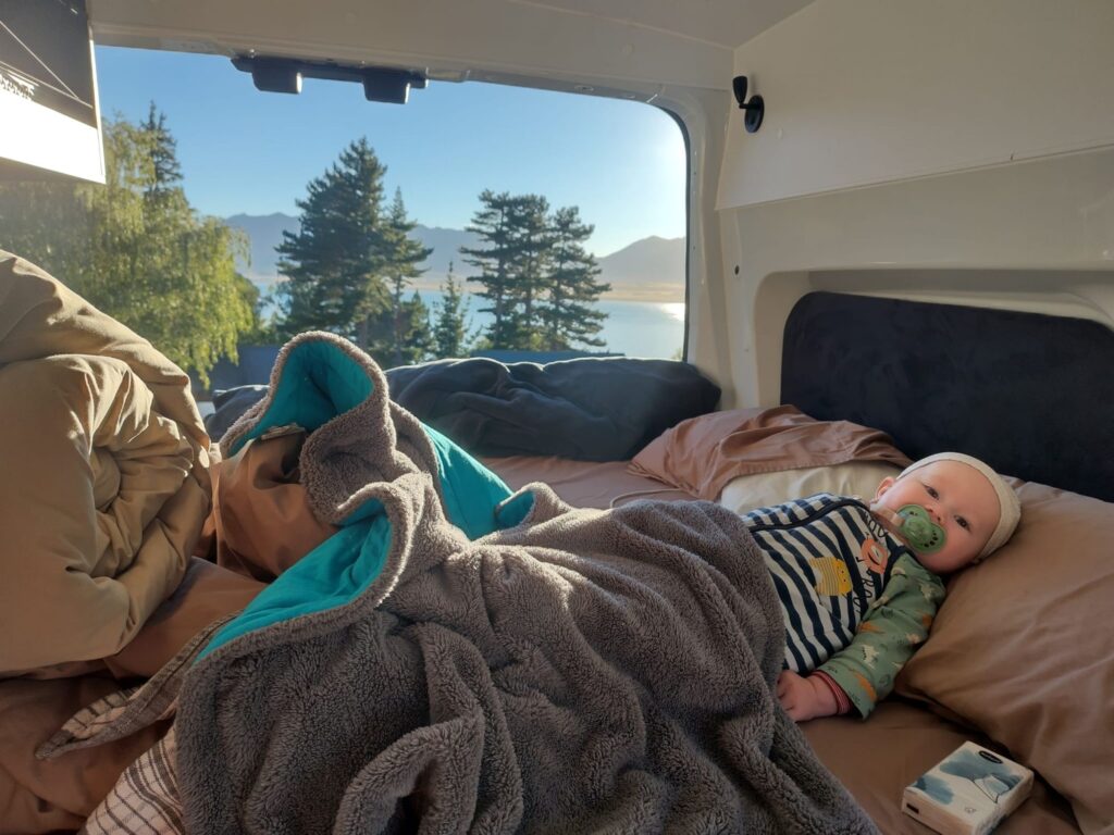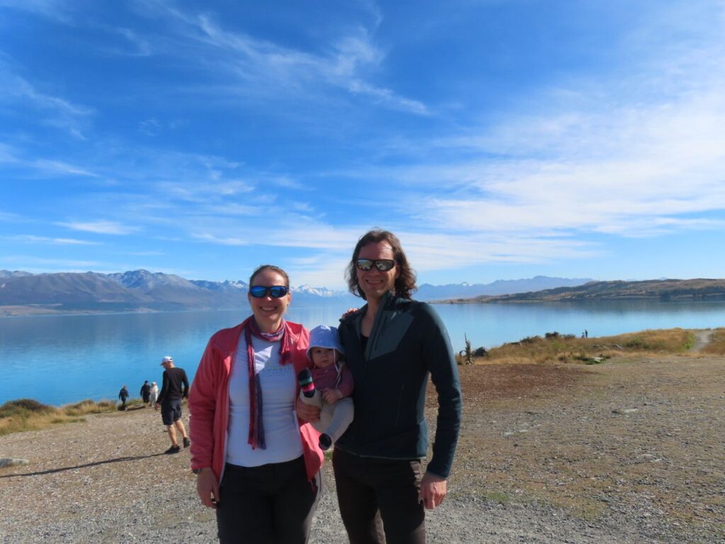 Die Fahrt ist wieder mal wunderschön und wir sind beeindruckt von der hübschen Landschaft. Wir sehen auch wieder viele Schafe und Rinder auf dem Weg und gewinnen den Eindruck, dass Landwirtschaft in Neuseeland einfach viel größer betrieben wird als bei uns. Wir halten öfter an, u.a. auch direkt am Wanaka Lake, wo wir unsere Stühle herausnehmen und direkt am Ufer des Sees eine Stillpause einlegen. Die Sonne tut gut, vor allem nach dem Regentag am Vortag. Als wir abends auf dem Campingplatz am Lake Hawea ankommen, sind wir allerdings nicht so begeistert. Unser Stellplatz liegt sehr weit von den Toiletten weg und der Campingplatz ist nicht sehr modern, die Anlagen in die Jahre gekommen. Das einzig nette ist die Lage direkt am Wasser und der Seeblick. Da wir noch voll von der Völlerei in Queenstown sind, essen wir abends nur etwas Brot und gehen dann ins Bett. Elias wacht nach dem Stillen um 20 Uhr zwar noch mal auf und ist dann länger wach, er ist aber ganz lieb und so lassen wir ihn machen. Es ist ja auch für ihn Urlaub.