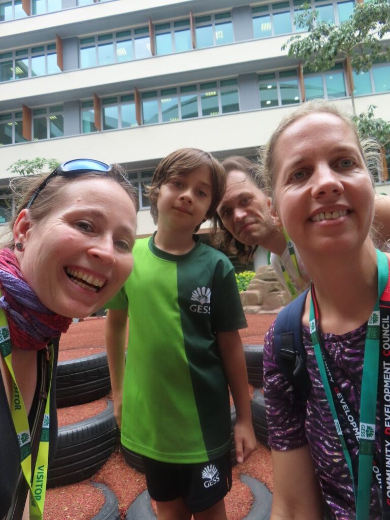 Unser Flug geht erst abends um 19:50 Uhr. Den Morgen gehen wir daher ruhig an, packen alles zusammen, machen uns fertig und spazieren dann noch ein bisschen in der Wohnanlage von Anne und Vin herum. Mittag essen wir zu Hause mit dem Vater von Vin und plaudern ein bisschen. Plötzlich ist Anne schon wieder zurück und es ist Zeit Nico von der Schule abzuholen, was wir heute alle gemeinsam machen. Er freut sich sehr und es entsteht ein nettes Selfie in der Schule.