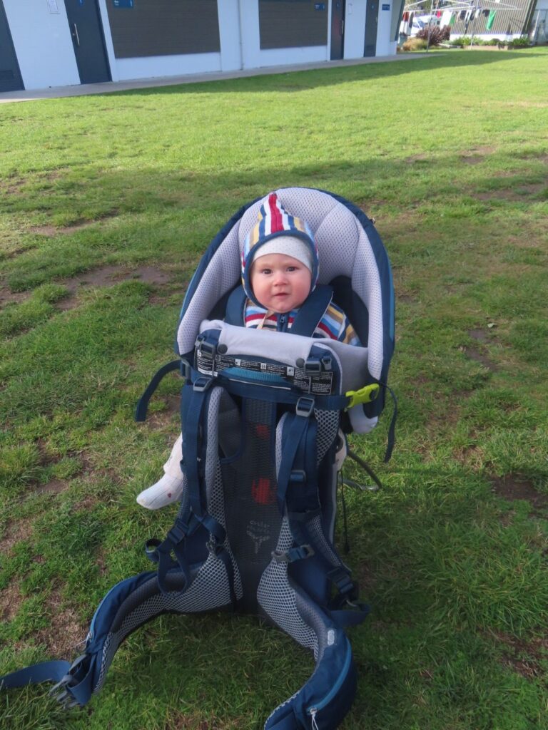 Nach der Übergabe des Campervans fahren wir einkaufen und dann direkt in den Holiday Park. Wir sind total fertig, trotzdem machen wir noch einen Spaziergang zum Strand, da die Sonne so schön scheint. Wir probieren zum ersten Mal die Babytrage aus, die wir von Freunden geschenkt bekommen haben, und sind begeistert. Eigentlich soll man die erst ab 8 Monaten verwenden, aber wir haben Elias vor der Abreise reingesetzt und sehen bei unserem eher kurzen Nutzungsverhalten keinen Grund, der dagegen spricht. Außerdem kochen wir abends noch Nudeln im Campervan, um zu testen ob alles funktioniert. Morgen könnten wir sonst noch einmal den Wagen tauschen, solange wir noch in der Nähe sind. Dann geht es ins Bett und wir können endlich schlafen.