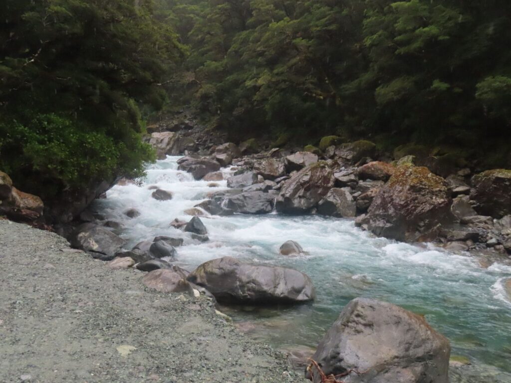 In Franz Josef angekommen, machen wir zunächst den Gletscherspaziergang. Der soll 30 Minuten gehen, aber nach 10 Minuten ist Schluss. Aus Sicherheitsgründen ist der Weg gesperrt, denn der Fluss hat seinen Lauf geändert dodthin wo der Wanderweg war. Wir sind enttäuscht und bereuen es am Fox Glacier, ein paar Kilometer vorher, den Gletscherspaziergang nicht gemacht zu haben. Also gehen wir den Weg zurück Richtung Parkplatz und machen den Sentinel Walk, der nur 20 Minuten gehen soll. Er entschädigt uns etwas für de kurzen Gletscherspaziergang, da es gut hochgeht und der Ausblick sich lohnt, auch, wenn auch dieser Weg nur kurz ist.