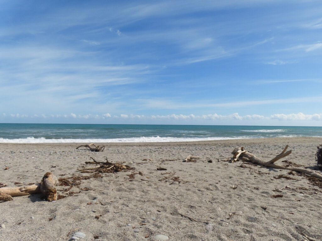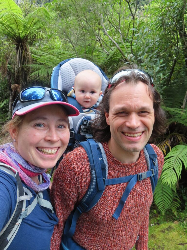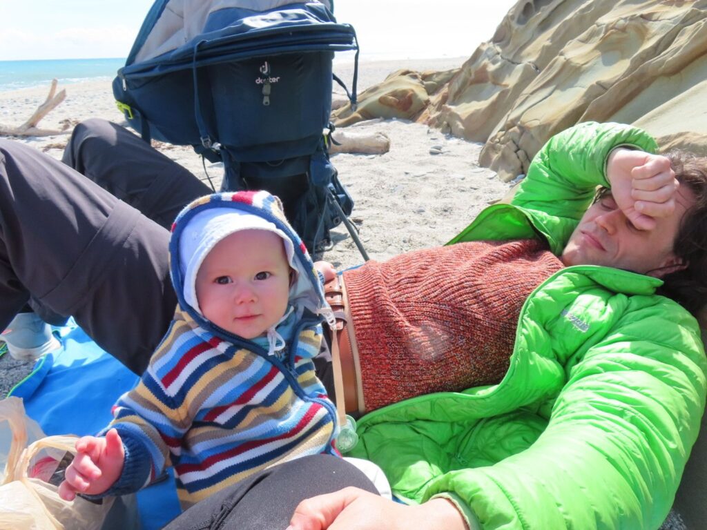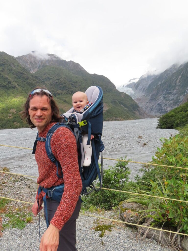 Am nächsten Morgen essen wir nur ein paar Kekse zum Frühstück und starten früh in den Tag, da wir ca. 4 Stunden zum Franz Josef Gletscher fahren müssen. Wir wollen lieber etwas mehr Puffer und Zeit unterwegs haben. Mittagspause machen wir bei Ankunft an der Westküste, direkt am Strand. Es ist schön bei Sonne im Sand zu liegen und Elias scheint es auch zu gefallen. Wir sind uns einig, dass das bisher der schönste Tag in Neuseeland war. Auf dem Rückweg zum Auto laufe ich noch durch das Wasser am Strand entlang. Es fühlt sich gar nicht so kalt an und ich kann mir vorstellen, darin die Tage noch mal zu baden.
