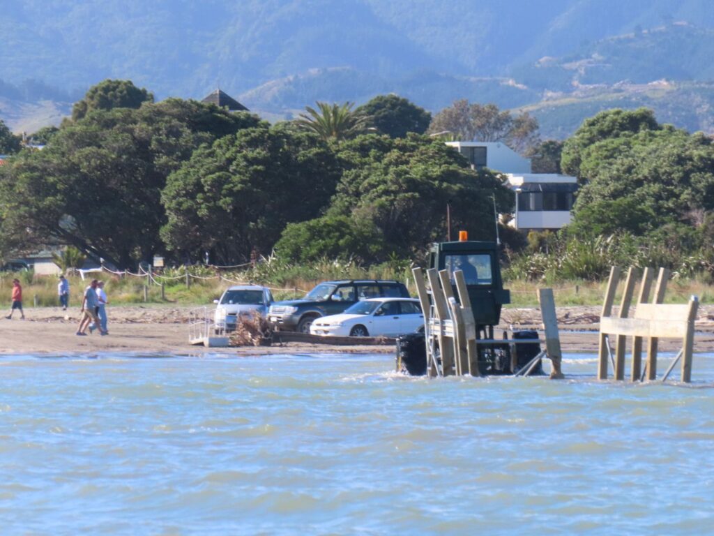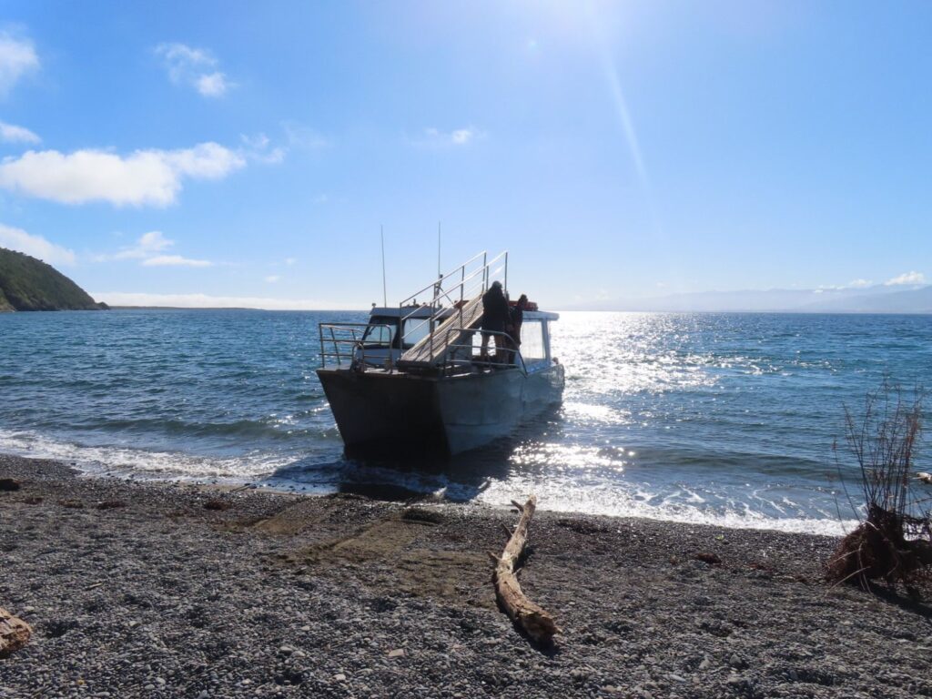 Von Nelson aus fahren wir zunächst mit dem Van ca. 1 Stunde nach Marahau, von wo aus unser Wassertaxi abfährt. Wir melden uns nach Ankunft im Büro an und steigen vor Ort in das Boot, das sich auf einem Anhänger befindet, der von einem Trekker gezogen wird. Dieser fährt uns dann zum Strand und lässt uns ins Wasser, da Ebbe ist. Sehr interessant, dass Trekker hier dafür benutzt werden. Haben wir woanders so noch nicht gesehen.