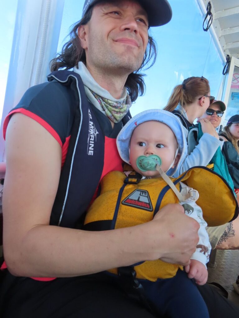 Wir bekommen alle Schwimmwesten, auch Elias. Er macht die Überfahrten gut mit, nickt irgendwann sogar ein. Ich übernehme kurz das Steuer als der Skipper draußen die Scheibe putzen muss.