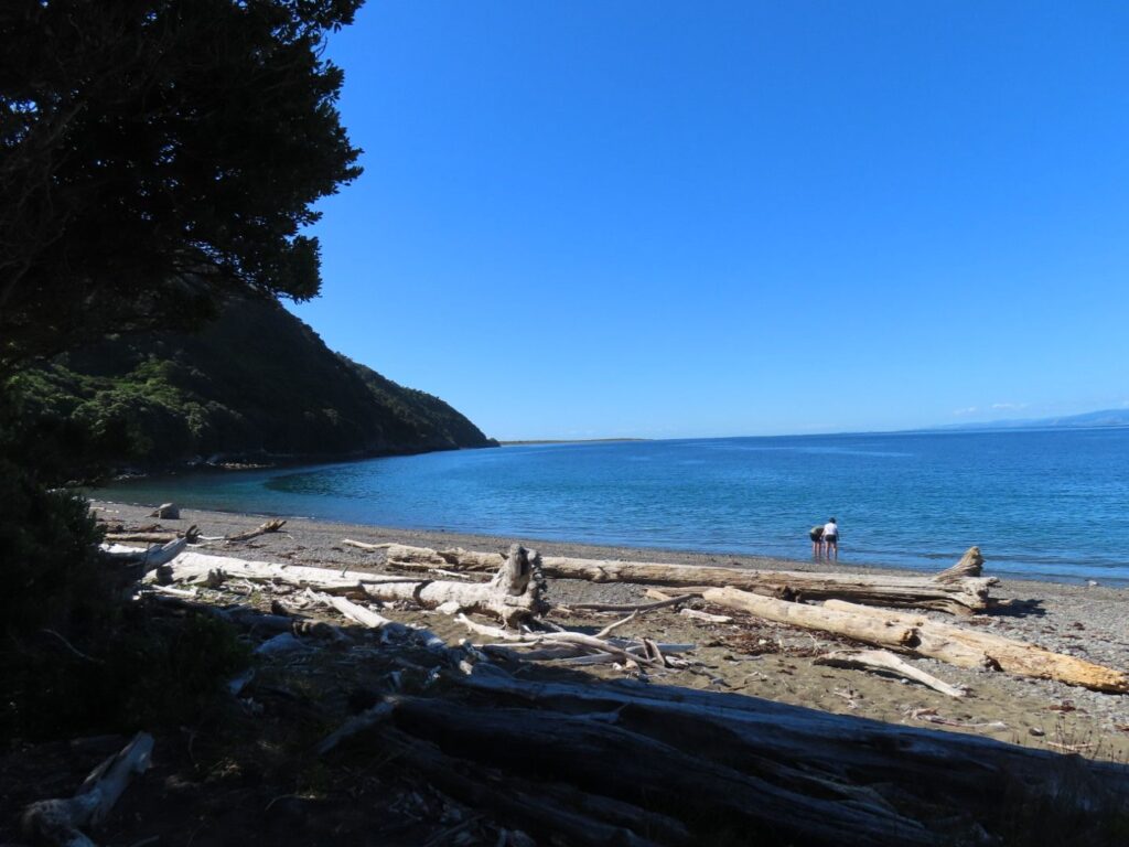 Die kurze Wanderung von der Torrent Bay zu Anchorage kann man nur bei Ebbe machen. Es ist meine allererste Wattwanderung und sie ist wunderschön. Wir stapfen in unseren Wasserschuhen durch den nassen Sand, entlang der hohen Pfeiler, die den Wanderweg markieren. Überall liegen Muscheln und es sind ganz kleine Krebse zu sehen. Allerdings bewegen die sich so schnell, dass man sie nicht fotografieren kann. Elias macht alles gut mit und schläft nach anfänglicher Begeisterung in der Kraxe ein.