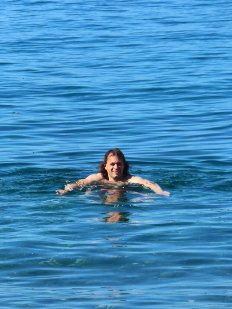 Das Wetter ist toll und wir beschließen den Ärger sofort hinter uns zu lassen und baden zu gehen. Elias wird in seinen hautengen Badeanzug gesteckt, eingerieben und in die Kraxe gesteckt. Wir ziehen unsere Badesachen an und laufen gemeinsam zum Strand. Das Gute ist, dass sich der Campingplatz wirklich direkt am Strand befindet. Außerdem haben wir Glück, da gerade Flut ist. Das Wasser ist auch nicht so kalt, aber von den 32 Grad vom Babyschwimmen doch etwas entfernt. Elias geht daher am Ende nur kurz rein und wird sogleich umgezogen und warm eingepackt. Kurz danach ist er auch schon eingeschlafen, wir haben ihn wohl ganz schön ausgepowert…
